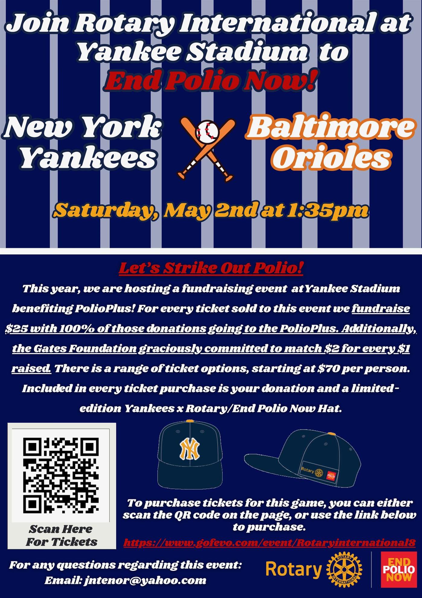 Join Rotary and the New York Yankees for a fun-filled day at Yankee Stadium on May 2nd at 1:35 PM!
