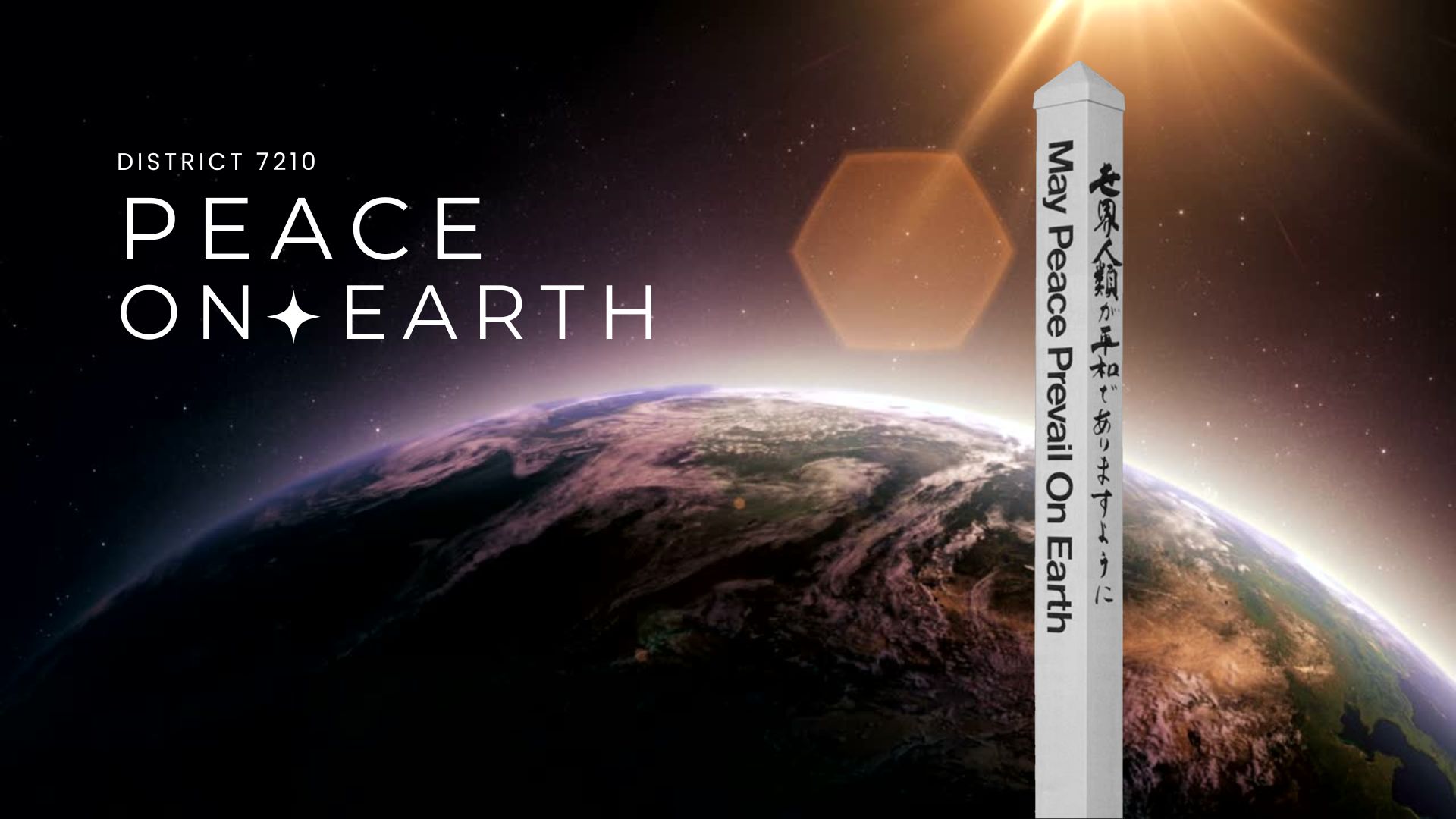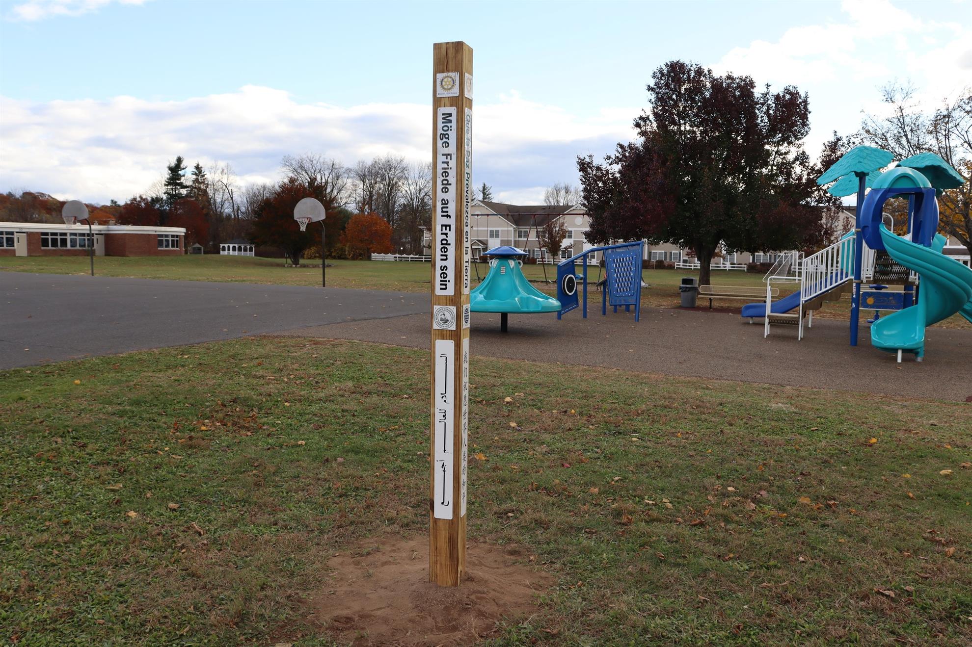 A Peace Pole is a monument that displays the message May Peace Prevail On Earth in the language of the country where it is placed. It usually displays 3 to 7 additional languages meaningful to the host site. The message is referred to as an affirmation of peace and its placement furthers Rotary’s goal of building a culture of peace throughout the world.